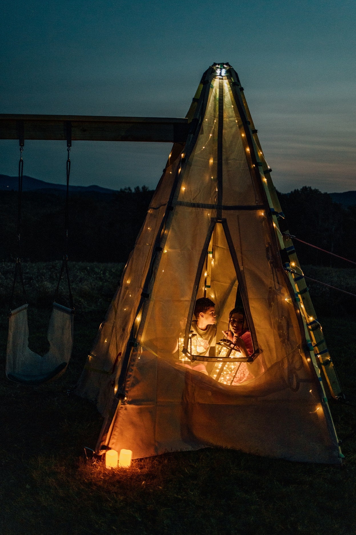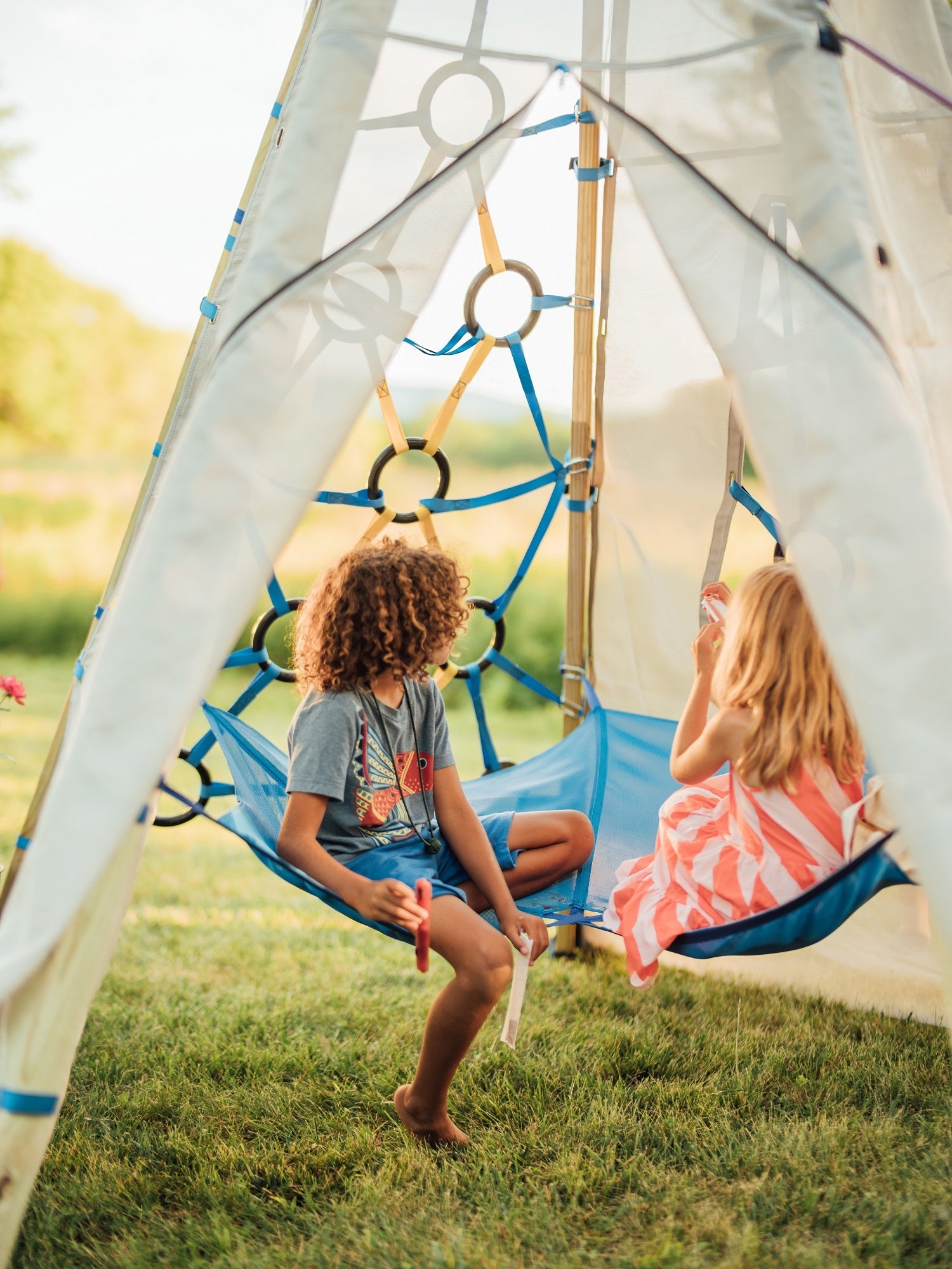 Bijou is a revolutionary collapsible play system that can quickly expand and adapt to your family's needs. It also has the strength to withstand harsh outdoor conditions, allowing it to remain up 365 days a year. It is crafted from powder-coated steel, UV-resistant recycled water bottle panels, and stainless steel hardware. It supports up to 250 lbs. and is designed for ages 3+.