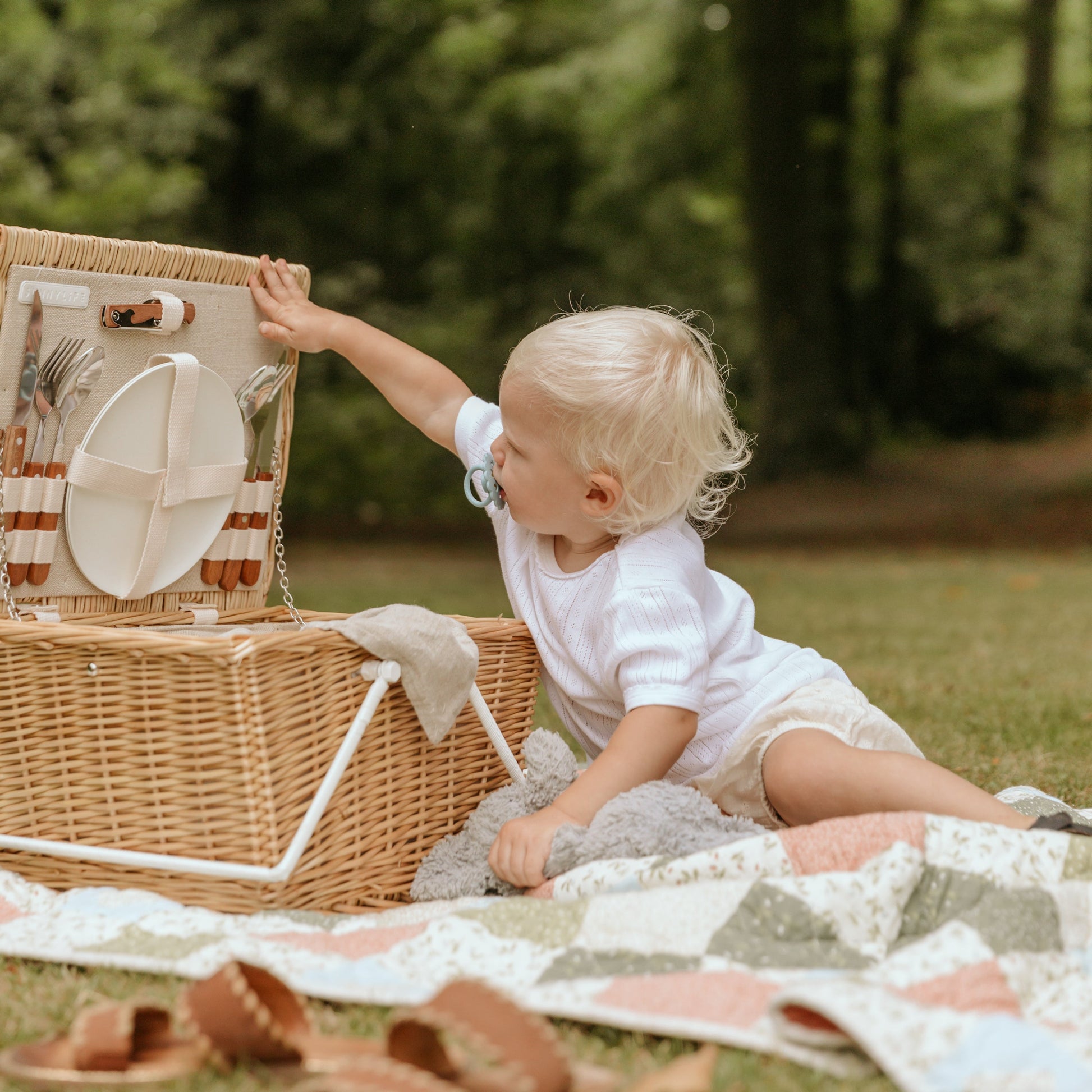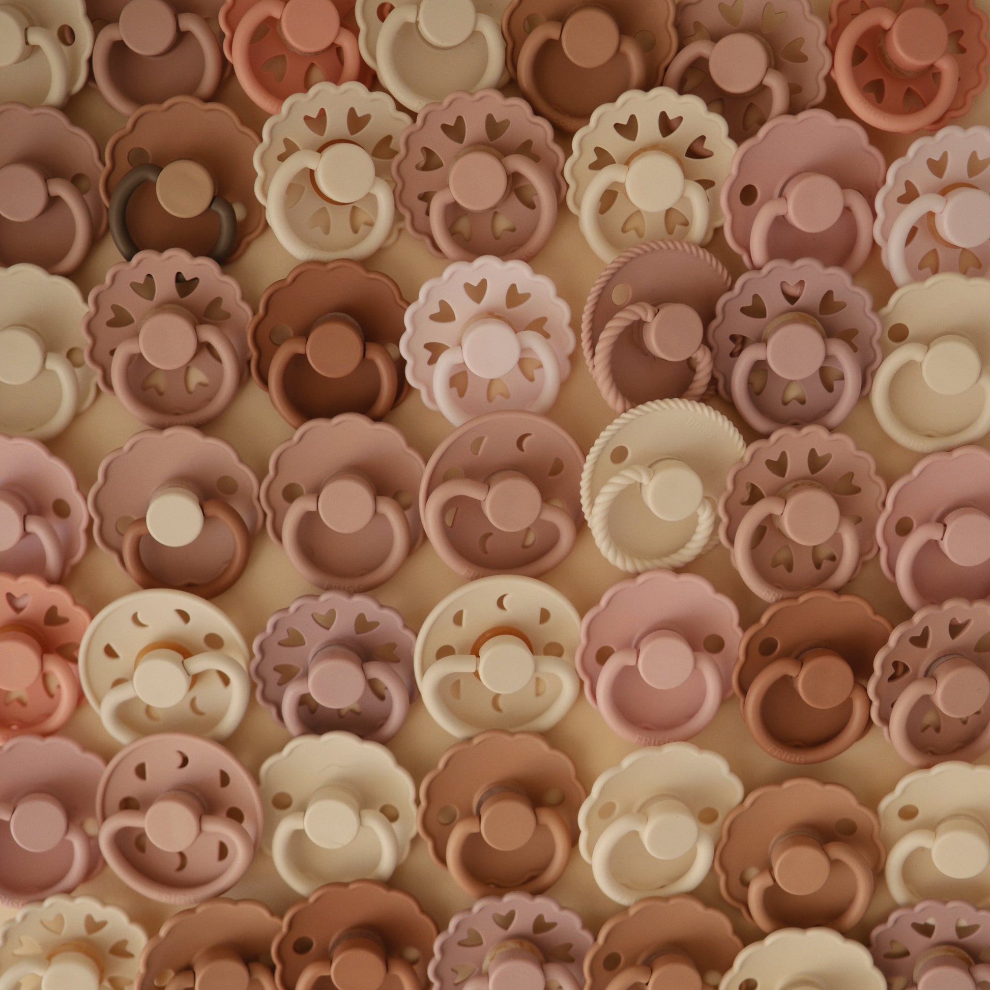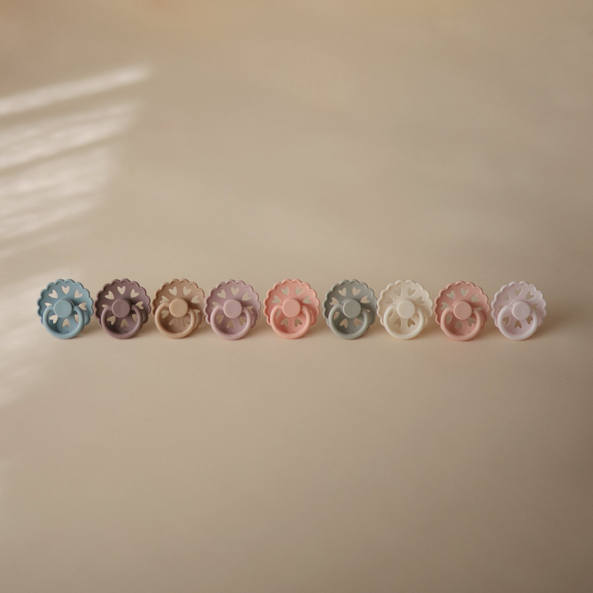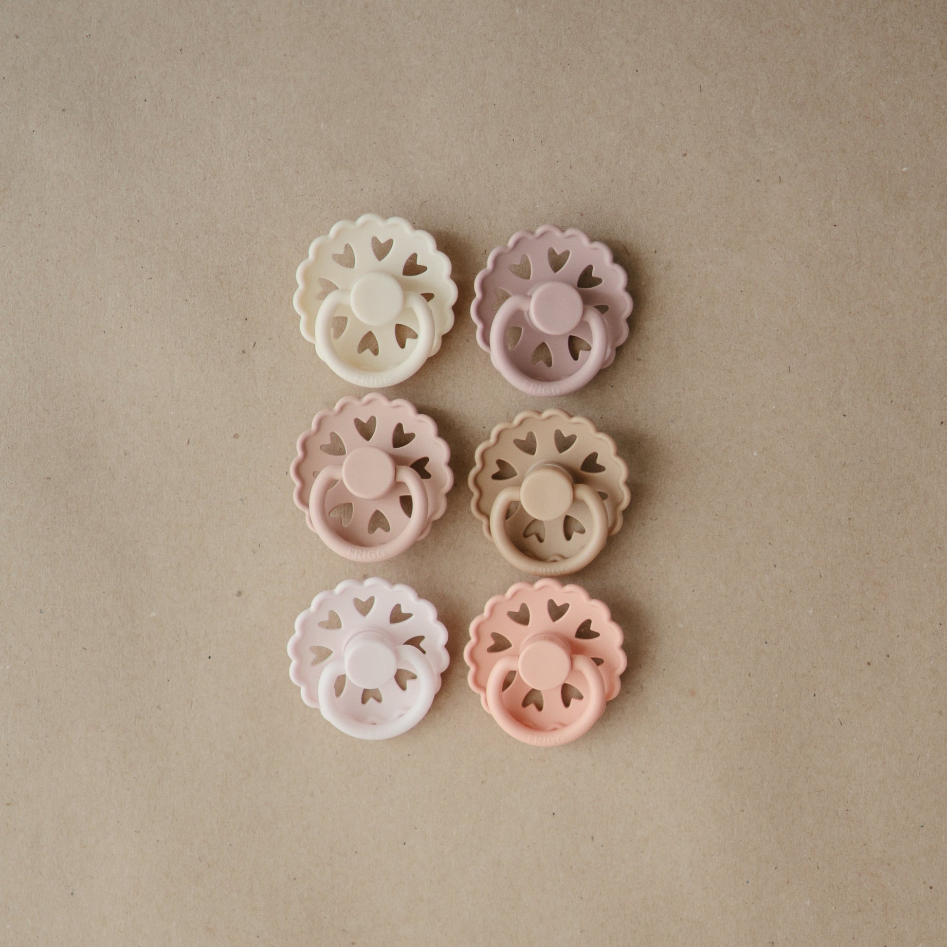 The FRIGG Fairytale silicone pacifiers are thoughtfully designed for your baby's comfort with an improved SilkySoftª nipple and an innovative Click-lock system. Each pacifier color draws inspiration from a timeless story by Danish author Hans Christian Andersen. The outward curve keeps the pacifier off delicate skin while features like air holes and a security handle ensure your baby's safety. Within the pacifier shield, air holes reveal eight little hearts that recreate Andersen's carved artwork motif and symbolize the universal language of love.