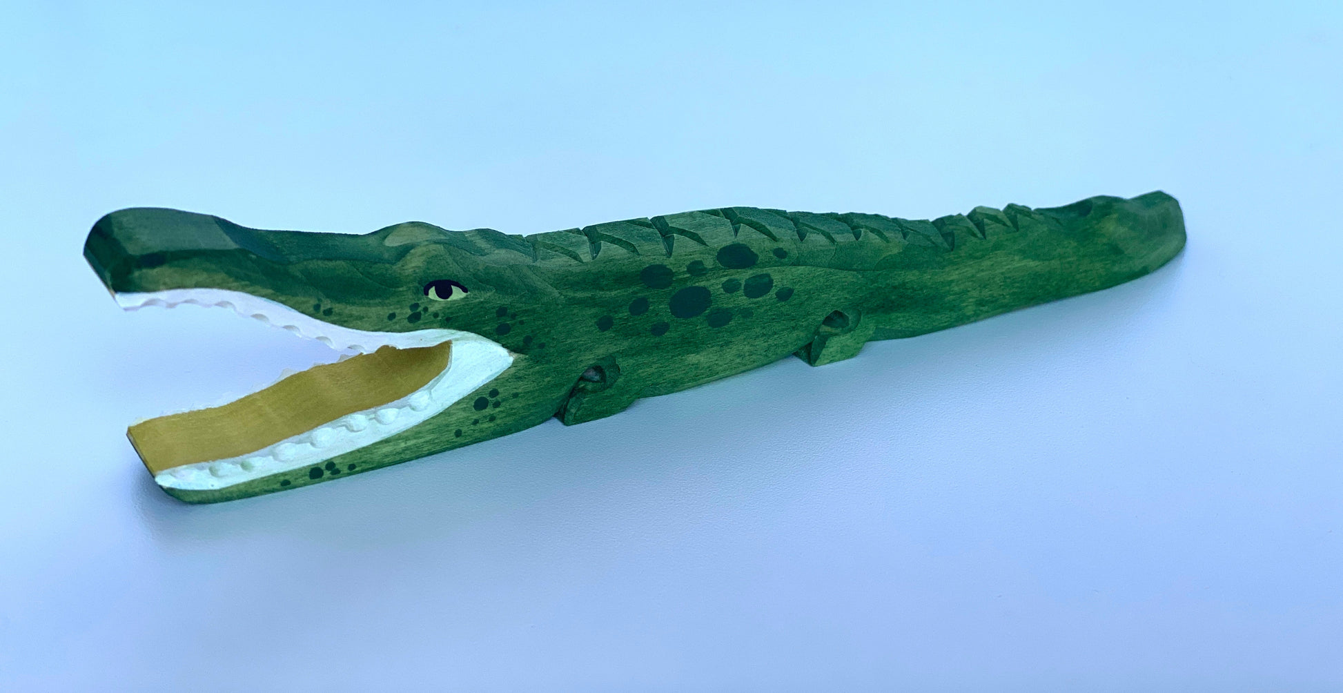 The Hand-carved and hand-painted wooden alligator figurine would be a great addition to any of your wooden toys collection.