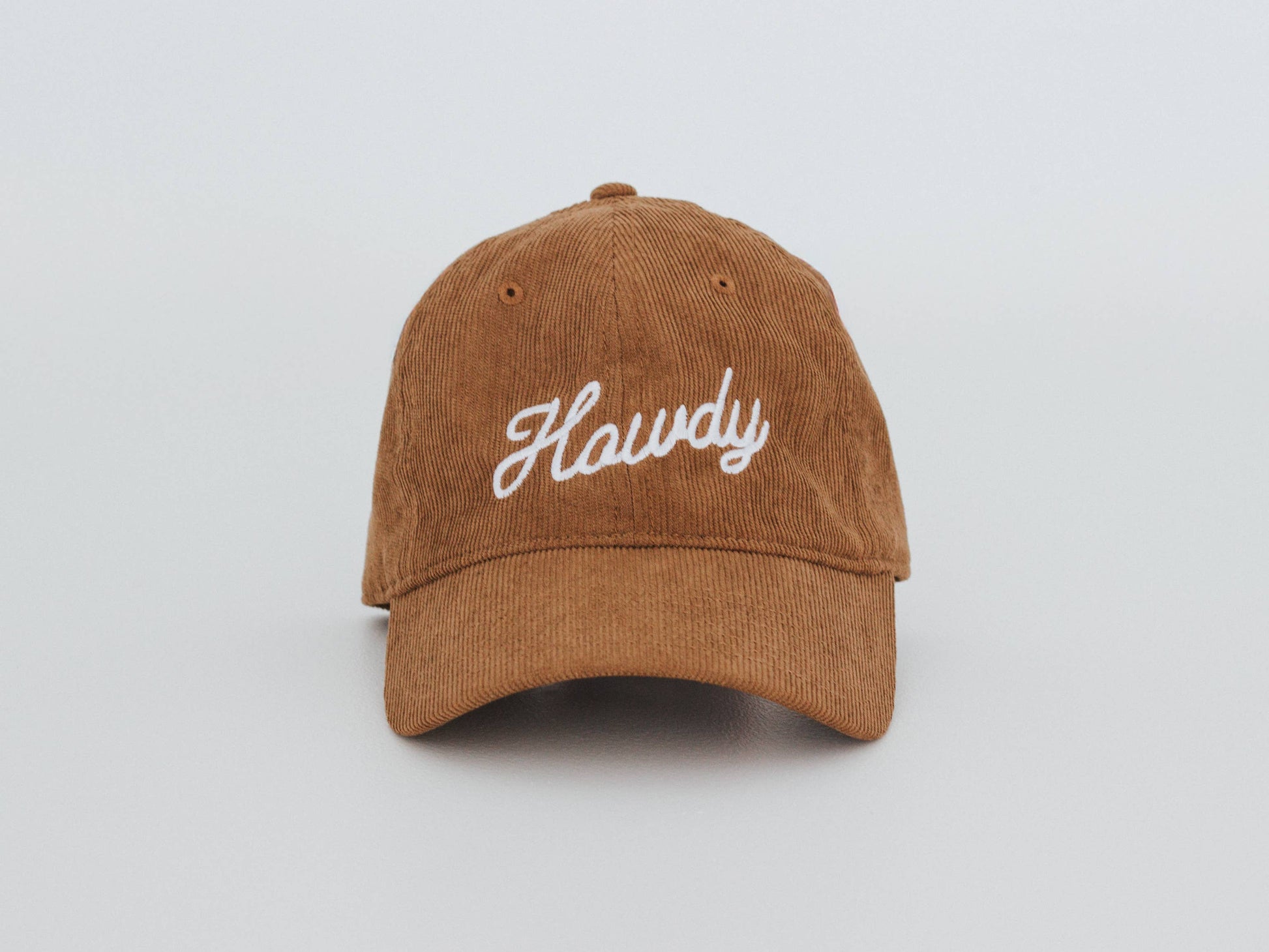 Tip your hat with a little southern charm. This playful cap features “Howdy” embroidered in crisp white script on soft brown corduroy—perfect for days in the garden, on the road, or just soaking up sunshine with a sweet tea in hand.