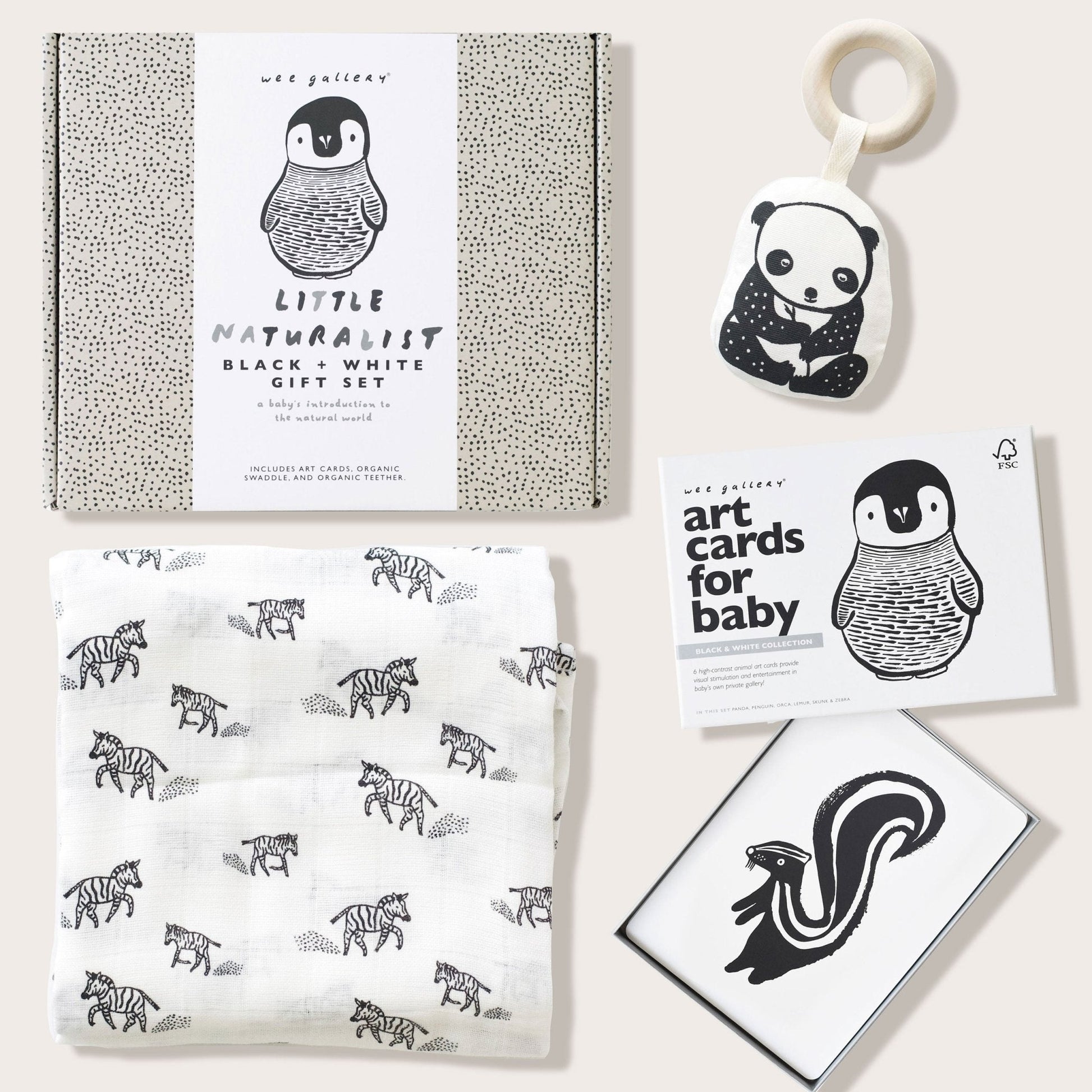 The sets are ready to be gifted in a lovely Wee Gallery box. This set features an Organic Panda Teether, Black & White Collection Art Cards and a Zebra Organic Muslin Swaddle