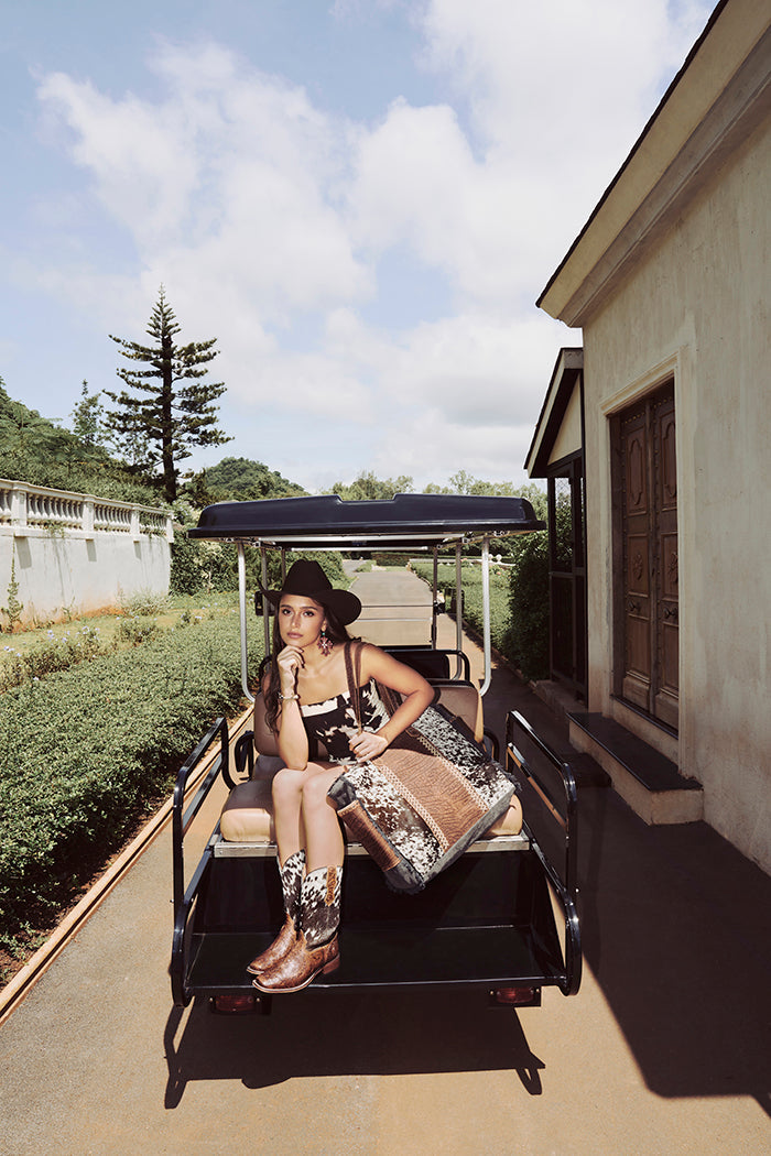 Make every getaway a bold statement with the Myra Saddle Belle Hairon Canvas Weekender Bag in Wild Clay. A true blend of Western flair and modern functionality, this weekender bag features a striking hairon hide front panel paired with textured canvas and saddle-toned leather accents. Spacious yet stylish, it’s ideal for spontaneous trips, weekend festivals, or road-bound adventures. Whether you're dressing up for a rodeo or escaping into the wilderness, this Myra weekender bag offers just the right amount of rugged charm and practical ease.