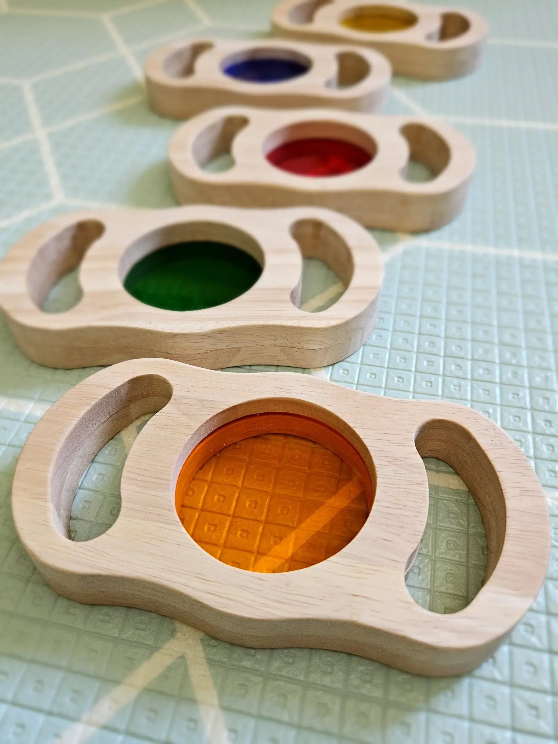 Children can hold them up to the light, stack them to blend colors, or incorporate them into building and imaginative play. From red and blue to yellow, orange, and green—each lens reveals a new way to see the world.