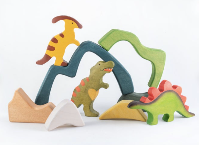 Beautiful Wooden Sculptural Mountains Blocks Stacker consists of 6 parts and it is perfect for open-ended and imaginative play. There are so many ways to play with this toy and so many options to create different things such as roads, tunnels, furniture, houses, and much much more. It can also be combined with any other building blocks set. It's a unique toy that will grow with your child and can be played in many ways. Wooden Dinosaurs set as shown in the picture sold separately.